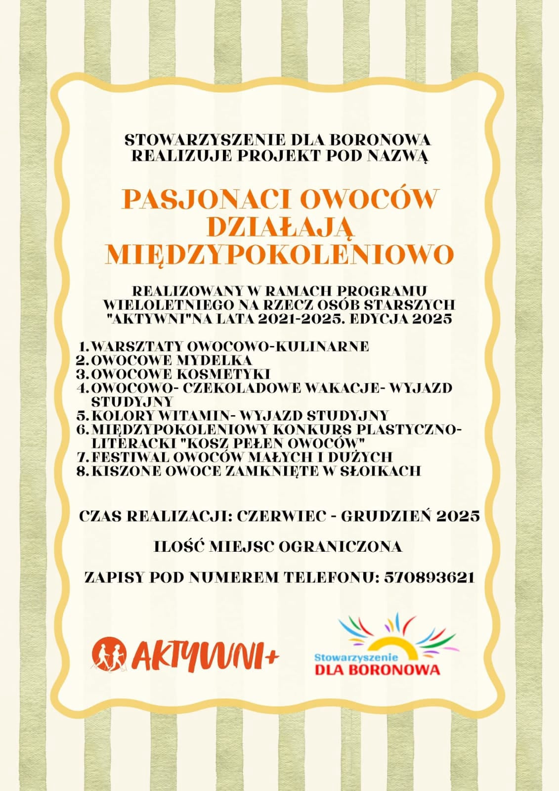 28 października 2025 roku w ramach realizowanego przez Stowarzyszenie dla Boronowa międzypokoleniowego projektu "Pasjonaci owoców działają międzypokoleniowo" zostały zorganizowane kulinarne warsztaty pod nazwą " Kiszone owoce zamknięte w słoikach".